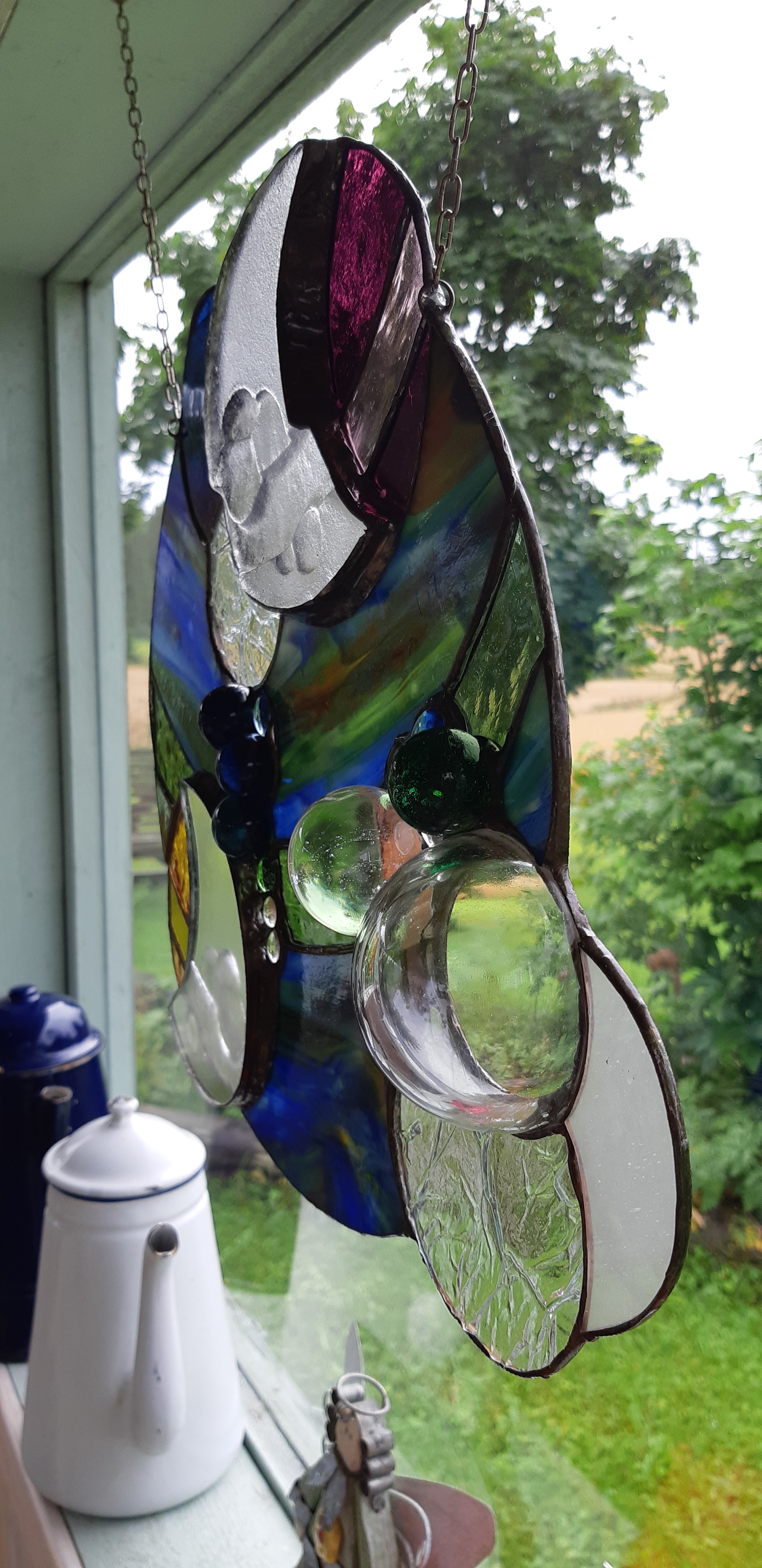 Kävimme lisäämässä huvimajan ikkunoihin valmistamiani lasitöitä vuosien varrelta. Tämäkin kuuluu siihen työhuoneeni siivoamiseen, ei jätetä hyllyille mitään vain olemaan.