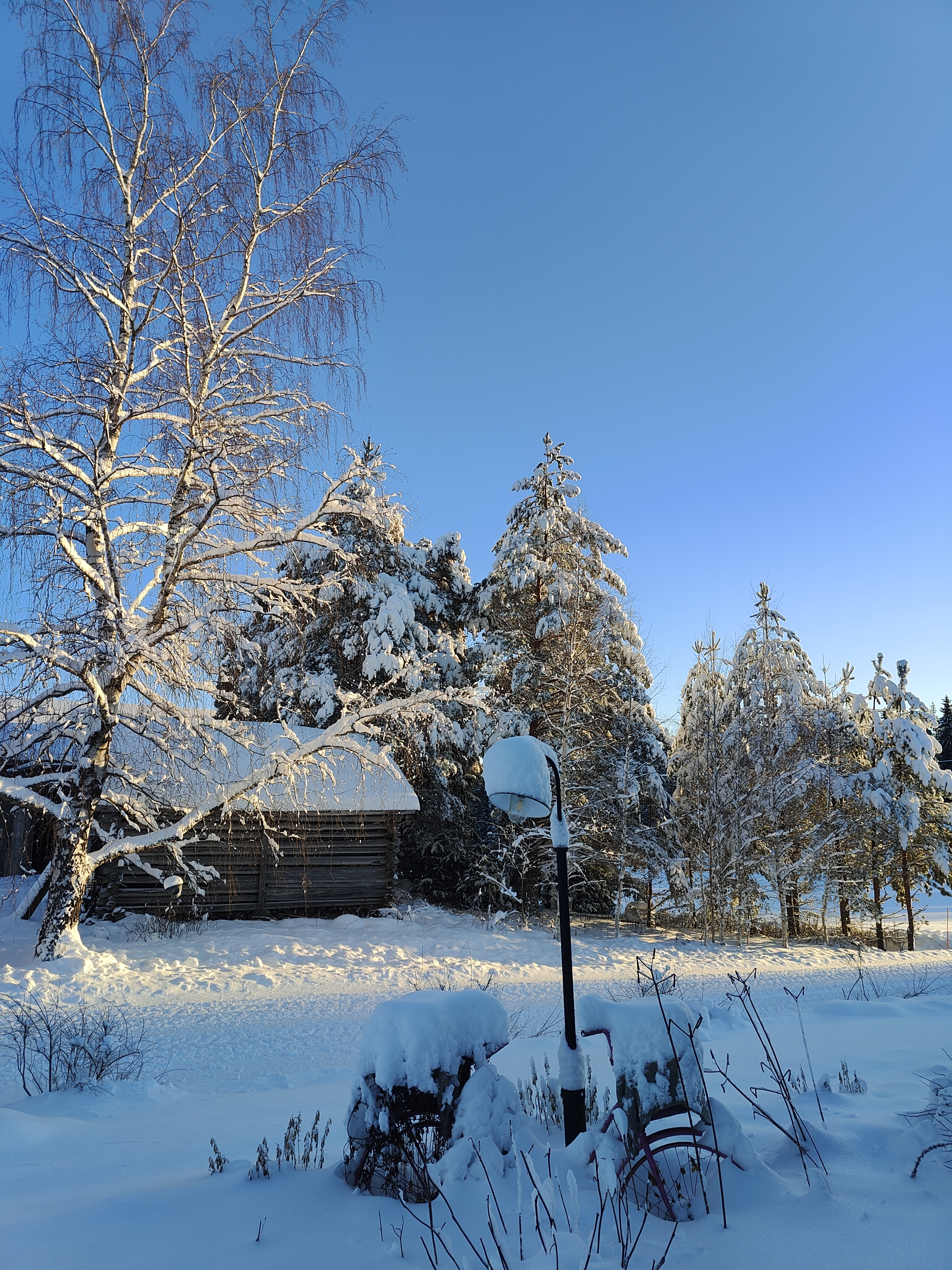 Päivän pituus ei ole näillä leveyksillä kuin reilun 5h. 5h 15min. Kun aurinko laskee kolmen jälkeen, nousee kuu valaisemaan maisemaa. Tällaisen sinisen hetken tallensin sunnuntaina, kun tarvoin hangella umpihangessa.